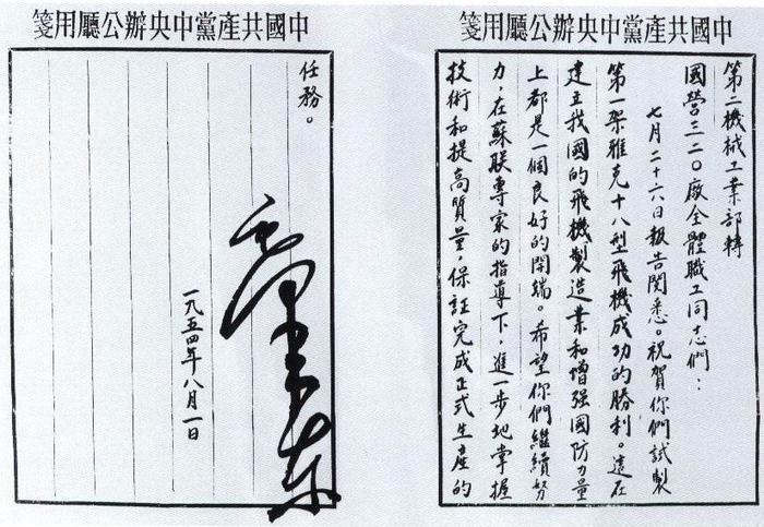 | 8月17日 | 聶榮臻、李富春向毛澤東主席并中央書記處報送航空工業3至5年由修理過渡到制造的發展計劃。8月20日,周恩來閱批:"擬予同意"。8月21日,毛澤東批示:"照辦"。劉少奇、陳云圈閱。12月10日,周恩來召集會議進一步肯定此計劃,還指示辦航空大學是應該的。 |